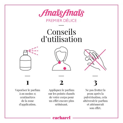 Vaporisez à environ 20 cm de la peau en privilégiant les points chauds de votre corps (à l’intérieur des poignets, sous le lobe de l’oreille).
