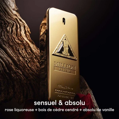 Succombez au charme incomparable du nouveau parfum ambré pour homme, signé Paco Rabanne. Puissant, mystérieux, intrigant, 1 Million Elixir se pare de son écrin luxueux emblématique : un flacon de parfum en forme de lingot d’or, habillé d’un triangle noir profond. Des notes de tête d’osmanthus et davana s’enrobent de rose de Damas et de cèdre, sur fond de fève tonka et de vanille. Parfum pour homme aux ingrédients récoltés dans le monde entier, 1 Million Elixir se porte comme un bijou. Un talisman.